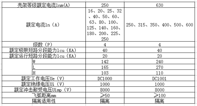 DC塑料外壳式断路器,适用于直流配电系统,其额定绝缘电压为1000V,额定工作电压DC1000V,额定工作电流至630A的电路中;特别适用于直流太阳能光伏发电系统;断路器具有过载、短路和欠压保护功能,能保护线路和电源设备不受损坏。